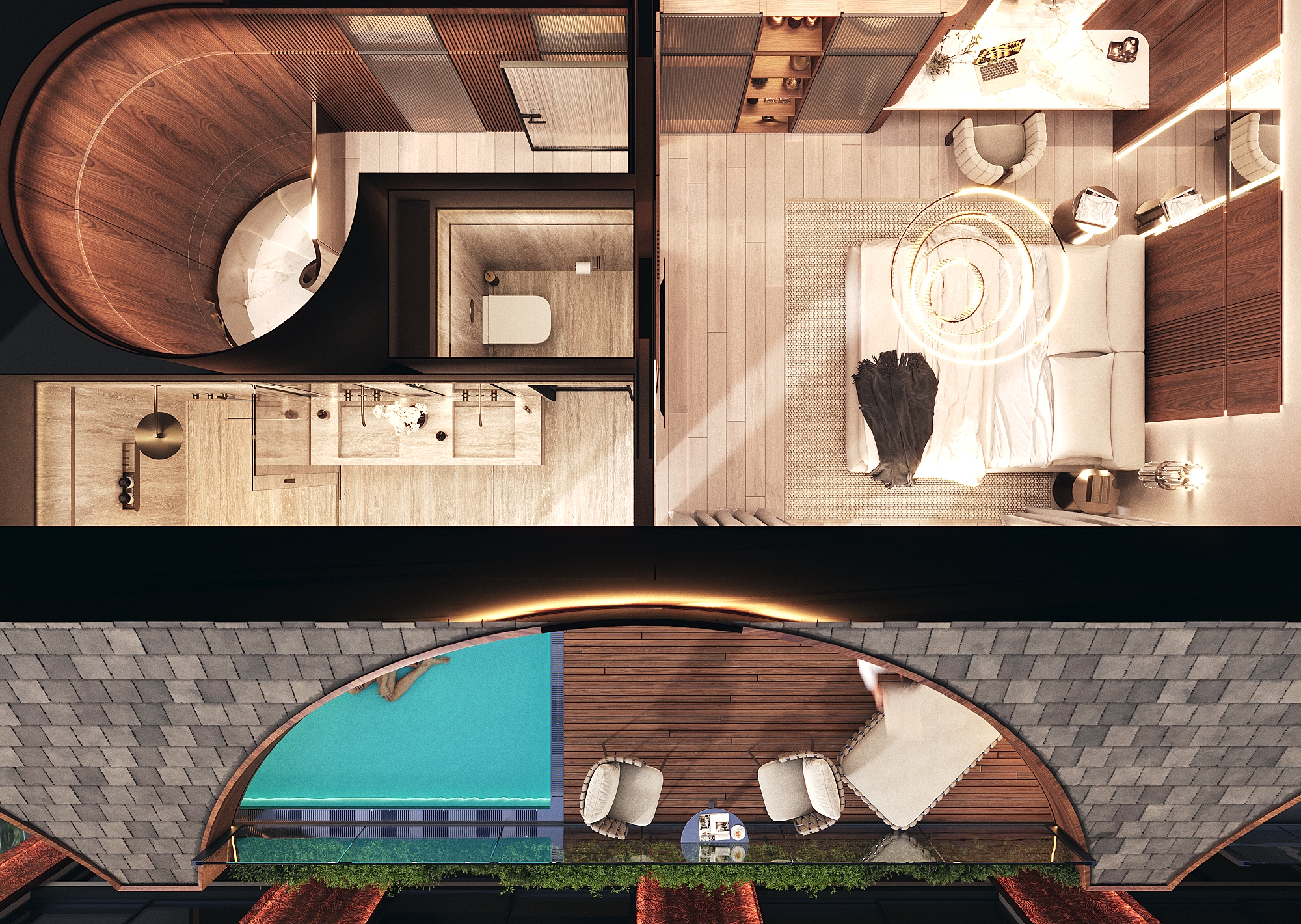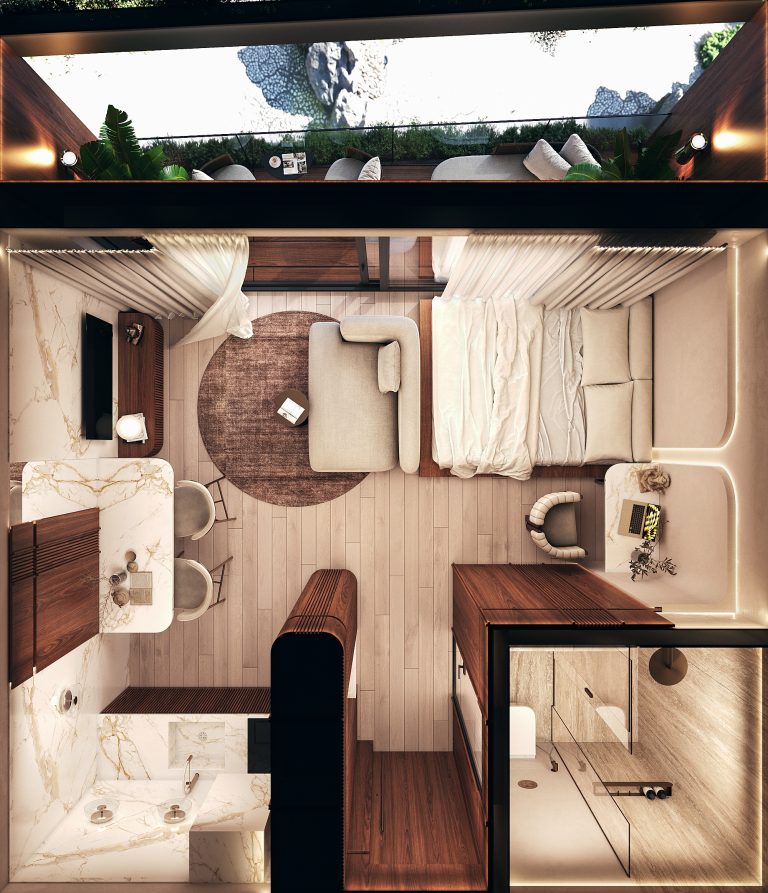 Функціональні студії з продуманим зонуванням. Деякі юніти мають джакузі та тераси.