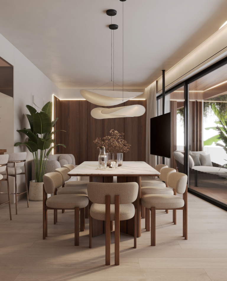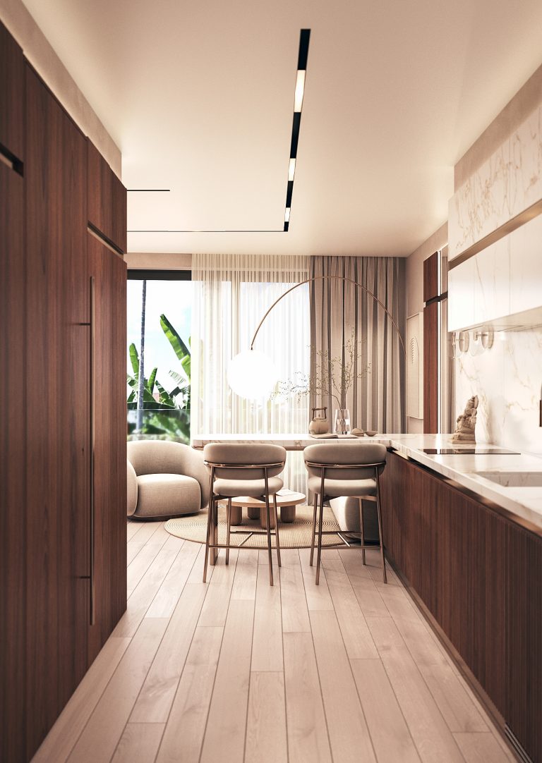 Архітектура в стилі тропічного модерну, що вписується в ландшафт Чангу, вивірені пропорції, натуральні текстури, м’яке світло та високі стелі. Усе це втілено для того, щоб апартаменти працювали не лише як житло, а як точка перезавантаження та місце сили.