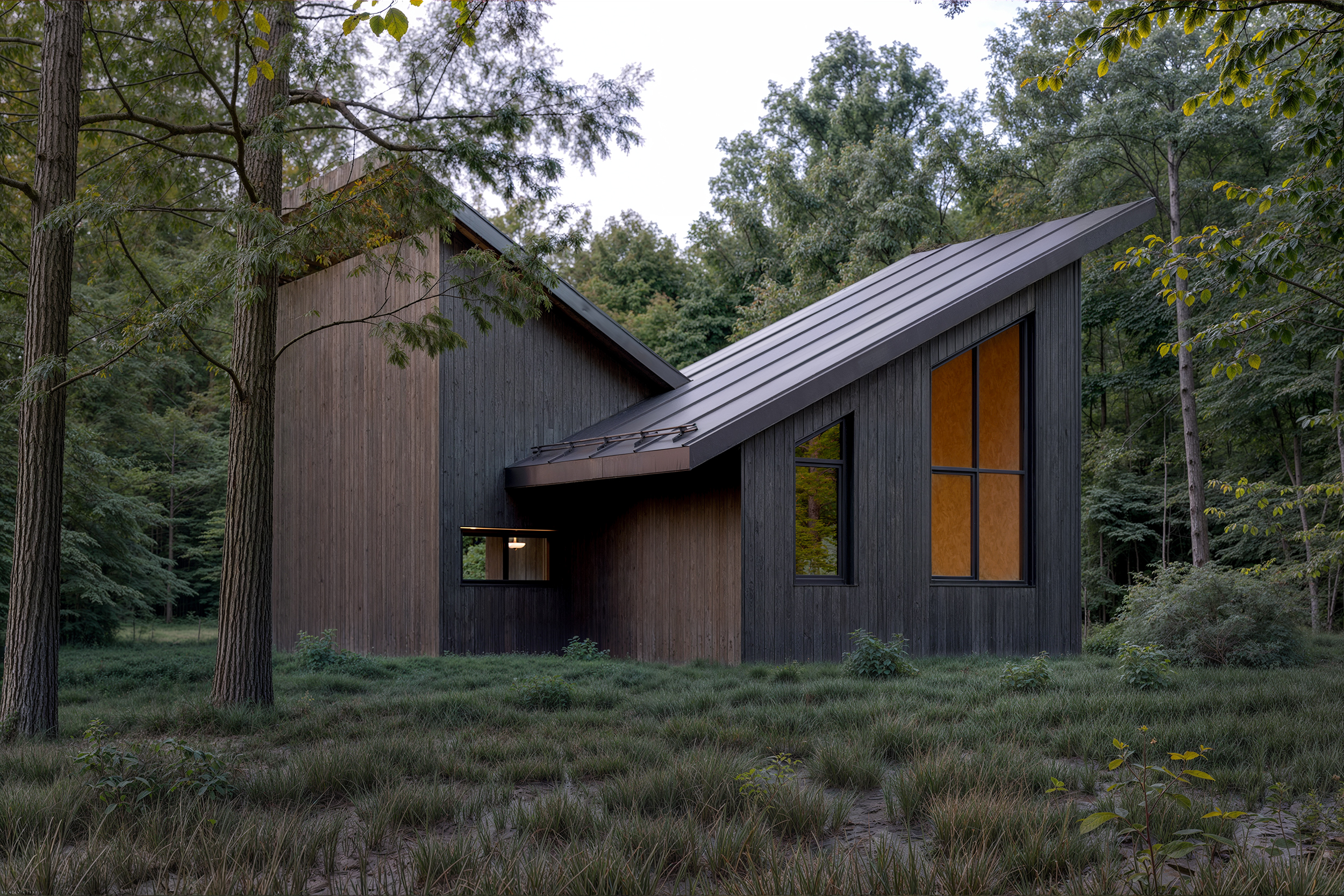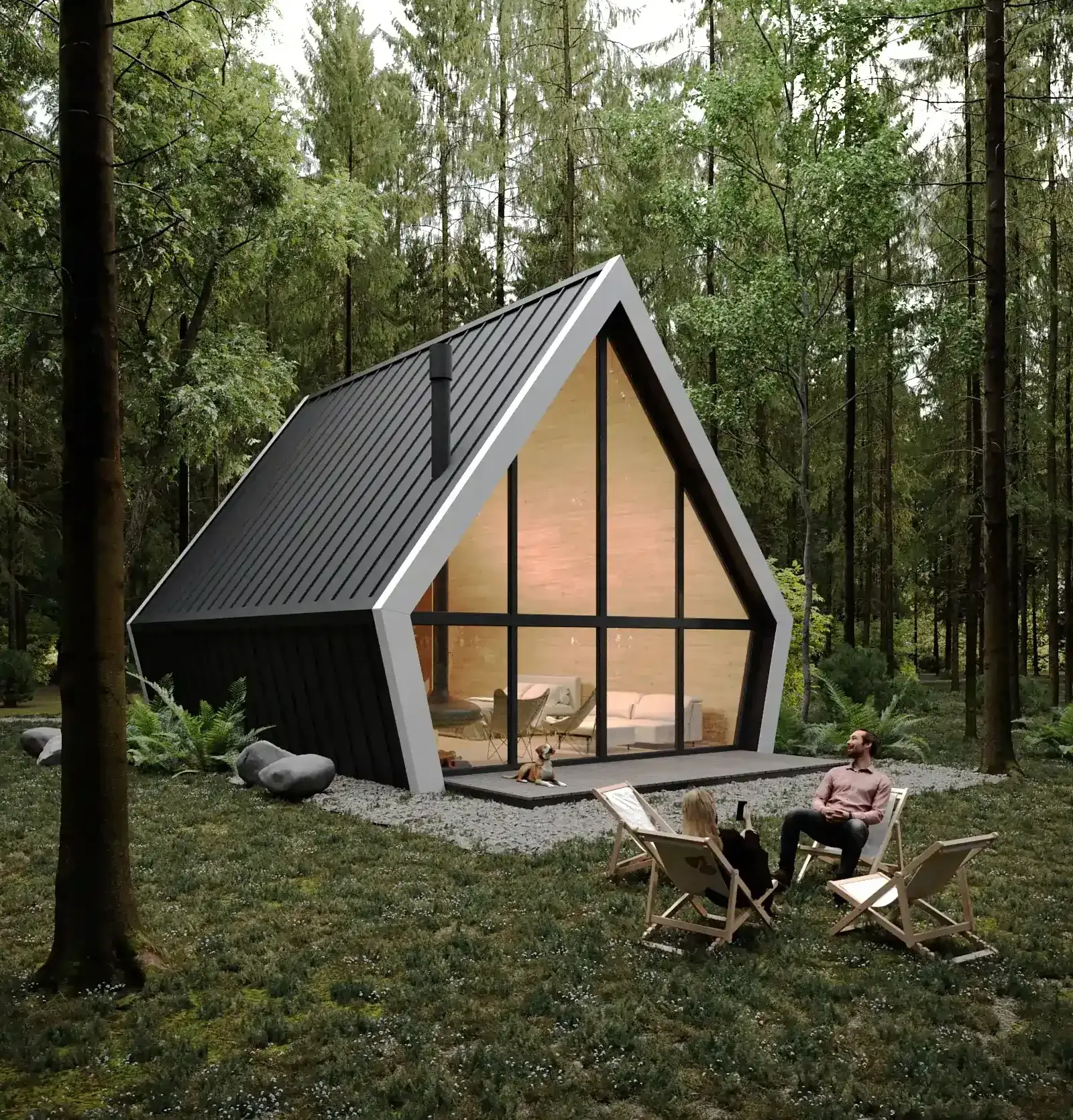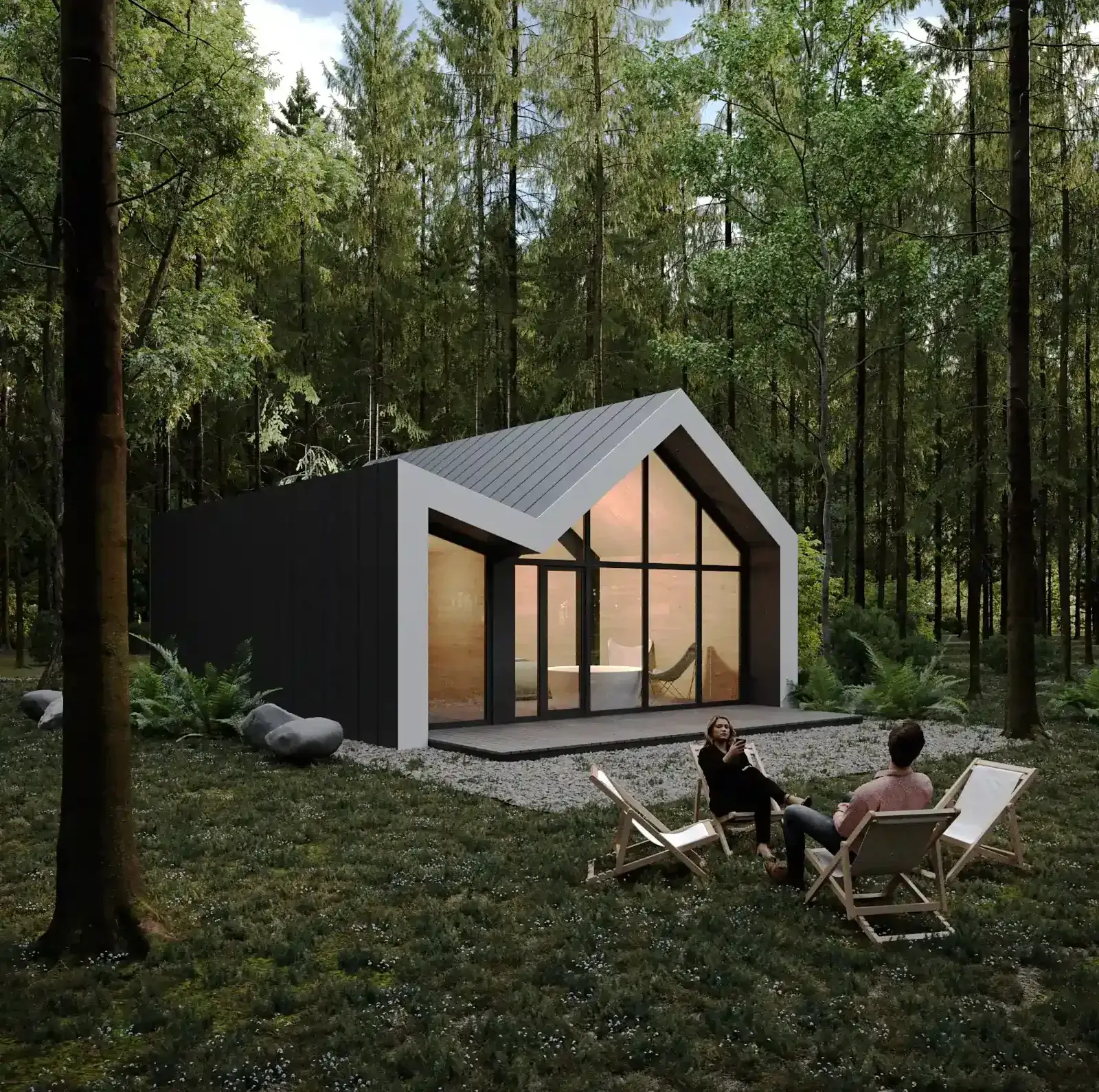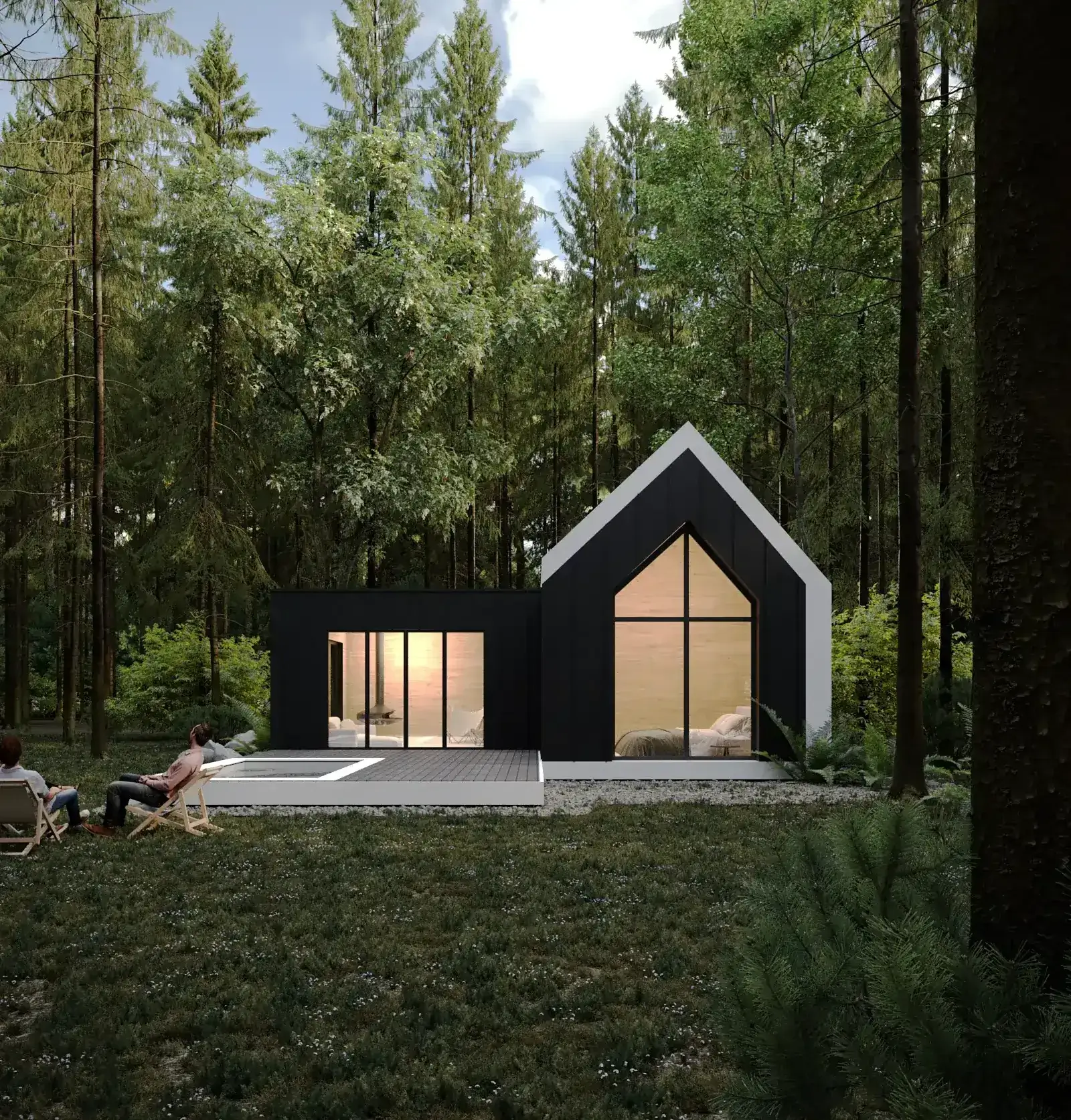 Використані матеріали — натуральне дерево та скло. Фасади у форматі A‑frame підтримують енергоефективність. Замість асфальту розміщені мінімалістичні доріжки.